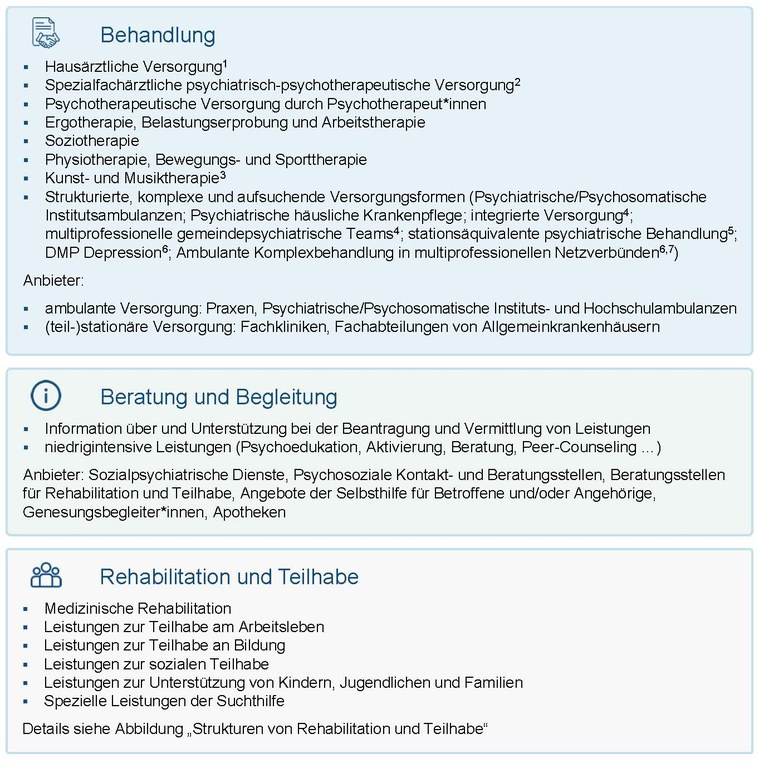 Die Abbildung dient der grundsätzlichen Orientierung und stellt keine vollständige Darstellung aller Angebote, Anbieter und Kostenträger dar. 1 FÄ für Allgemeinmedizin (mit obligatorischer Qualifikation in psychosomatischer Grundversorgung); FÄ für Innere Medizin sowie weitere historische Fachbezeichnungen; 2 FÄ für Psychiatrie und Psychotherapie, FÄ für Psychosomatische Medizin und Psychotherapie, Ärzt*innen mit Zusatzbezeichnung Psychotherapie und Psychoanalyse sowie weitere historische Fachbezeichnungen; 3 nur im stationären Kontext verfügbar; 4 nicht in allen Regionen und/oder bei allen Krankenkassen verfügbar; 5nach § 115d, SGB V; 6 zum Zeitpunkt der Veröffentlichung der NVL noch nicht umgesetzt/verfügbar; 7 KSV-Psych-RiLi nach § 92 Abs. 6b SGB V |