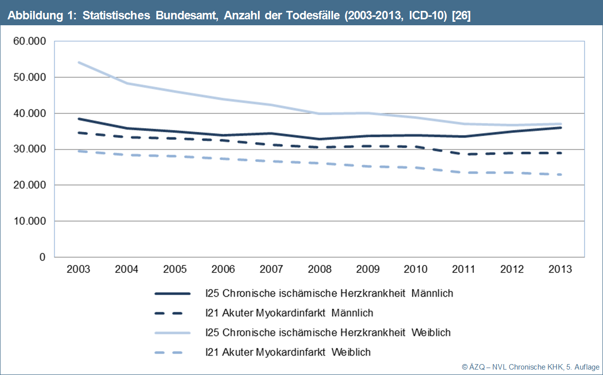 Die chronische KHK und der akute Myokardinfarkt führen die Todesursachenstatistik in Deutschland an, wobei in den letzten zehn Jahren der Anteil der Todesfälle gesunken ist 24179. Im Vergleich zu 2003, als 10,9% (n = 92 637) der Verstorbenen einer chronisch-ischämischen Herzkrankheit und 7,5% (n = 64 229) einem akuten Myokardinfarkt erlagen, sank der Anteil 2013 auf 8,2% (n = 73 176) bzw. 5,8% (n = 52 044). Von den 2013 an einer chronisch-ischämischen Herzkrankheit Verstorbenen waren 49% (n = 36 049) Männer und 51% (n = 37 127) Frauen, von den an einem akuten Myokardinfarkt Verstorbenen 56% (n = 28 991) Männer und 44% (n = 23 053) Frauen 24179.
