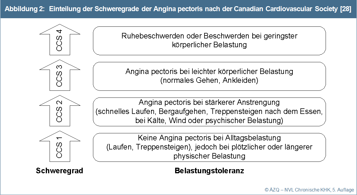 Das klinische Bild der chronischen KHK ist sehr variabel. Betroffene können asymptomatisch sein – und das auch, wenn Myokardischämien auftreten (Silent myocardial ischemia, stumme Myokardischämien), sie können unter Belastungsdyspnoe oder unter der als typisch angesehenen belastungsabhängigen Angina pectoris leiden. Die stabile Angina pectoris ist definiert als durch körperliche oder psychische Belastung reproduzierbarer Thoraxschmerz, der in Ruhe oder nach Gabe von Nitroglyzerin verschwindet. Abhängig von der individuellen Belastungstoleranz werden nach der Canadian Cardiovascular Society (CCS) verschiedene Schweregrade der stabilen Angina pectoris unterschieden 2469 (siehe Abbildung 2).